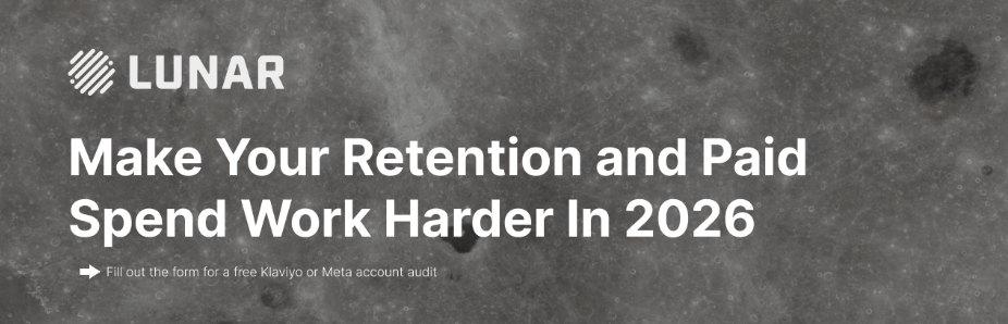 To kick off the new year, Lunar is offering a free Retention or Growth Audit, tailored specifically to Klaviyo and Meta. The audit covers things like lifecycle flow health, segmentation opportunities, creative and messaging alignment, and paid efficiency, all with practical recommendations you can actually implement. → Request a free Retention or Growth Audit (Klaviyo + Meta)